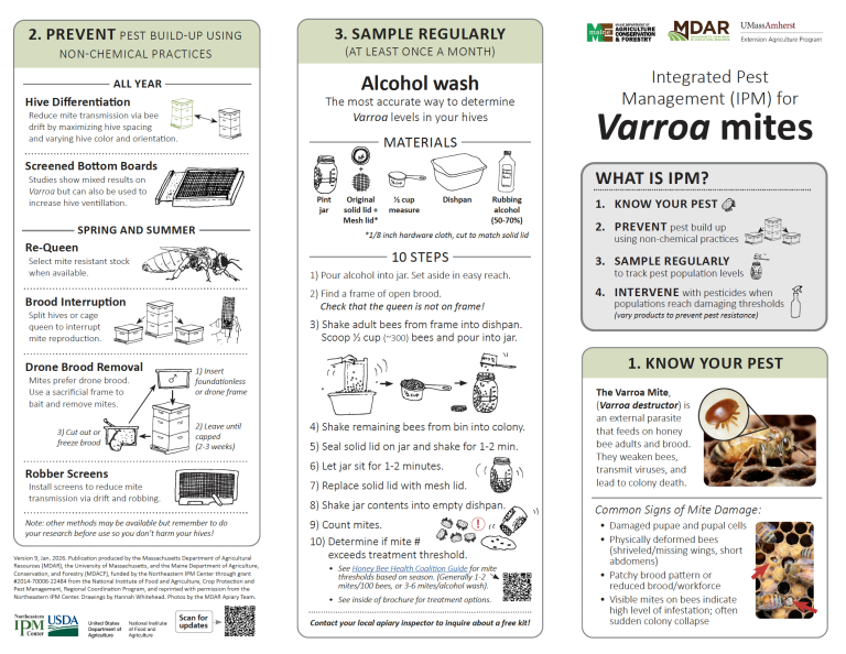 A new printable guide of “Integrated Pest Management (IPM) for Varroa Mites” is now available on the Maine Department of Agriculture website. It focuses on sustainable, multi-tactic control of varroa, including population monitoring, understanding mite biology, using injury thresholds for treatment decisions, and minimizing chemical reliance.
